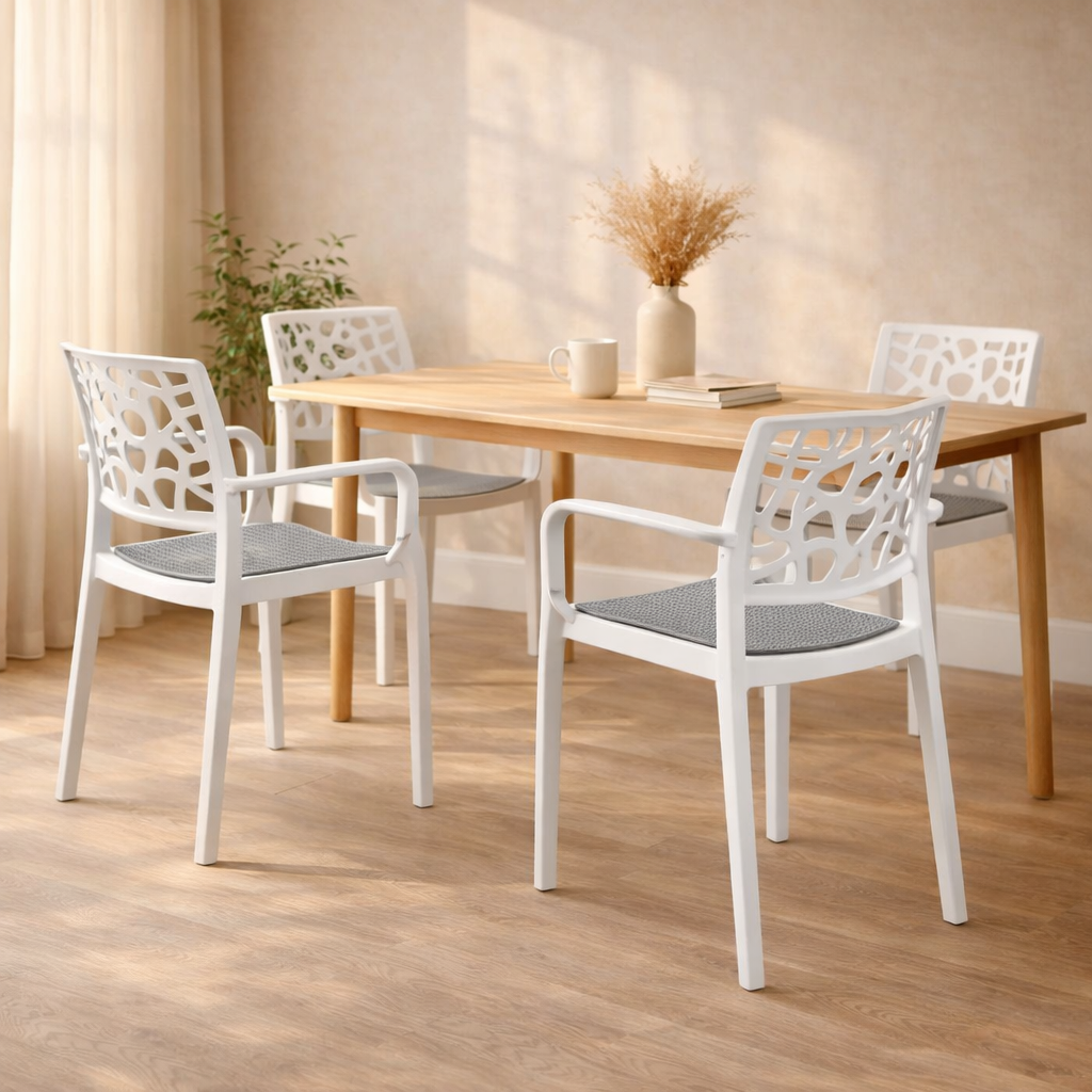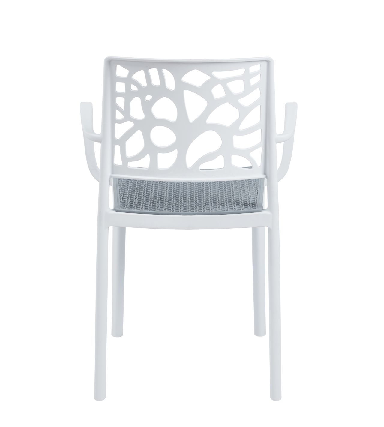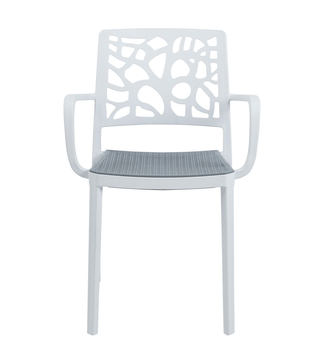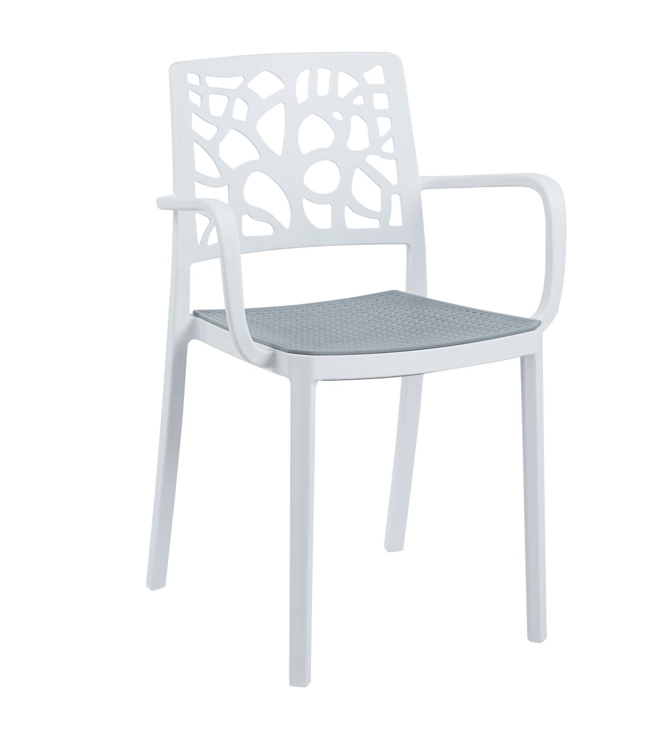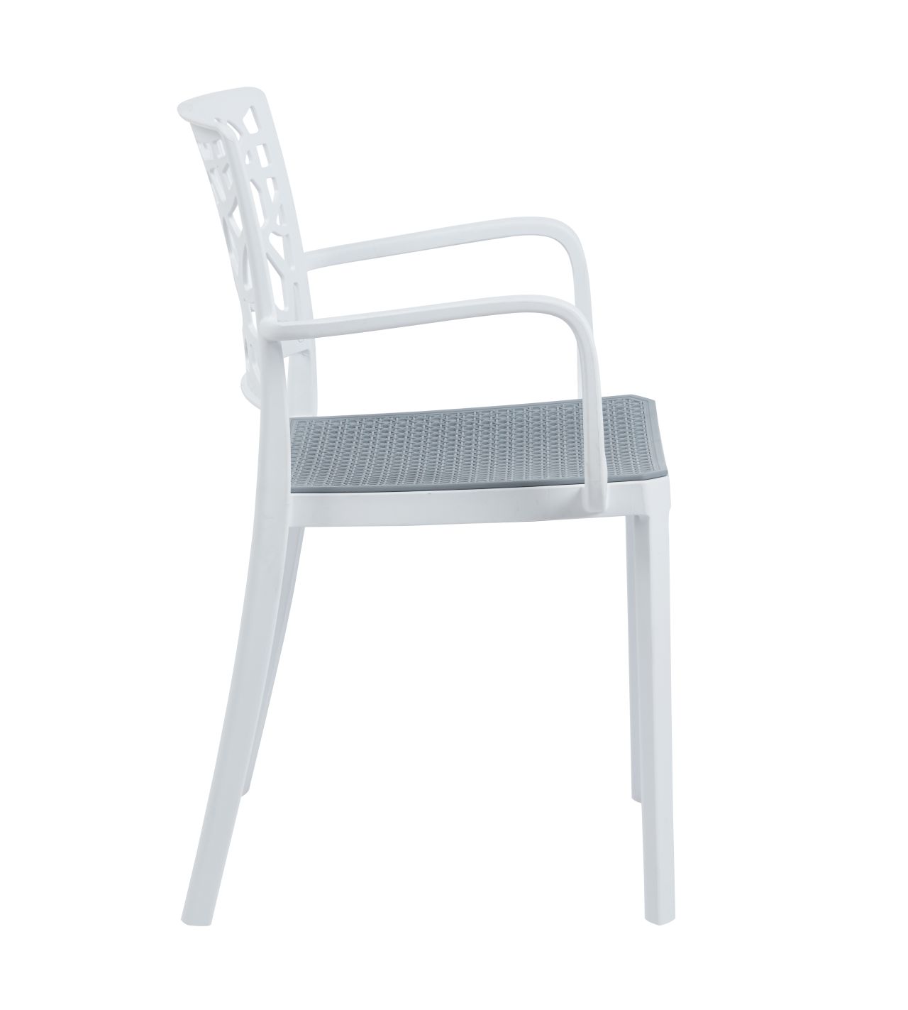 Stuhl mit Armlehnen, leichte Konstruktion mit dekorativer durchbrochener Rückenlehne und strukturierter karierter Sitzfläche. Leicht, modern und bequem - ideal für Restaurants, Cafés und Gärten.