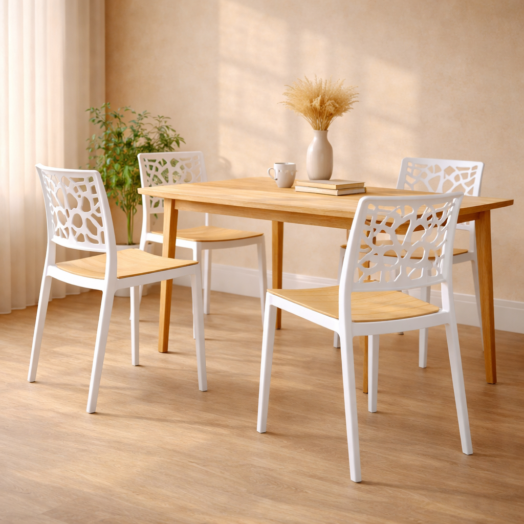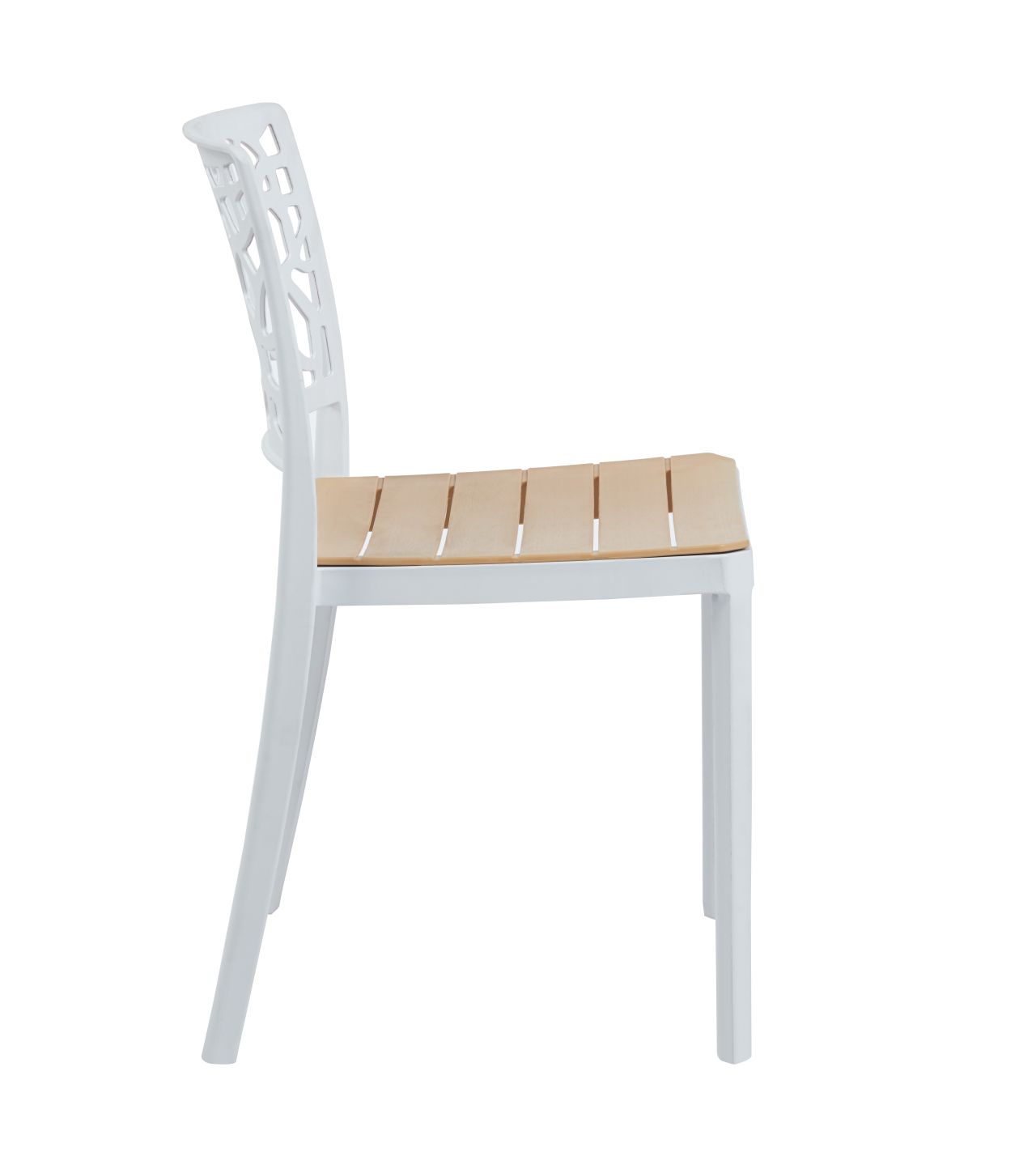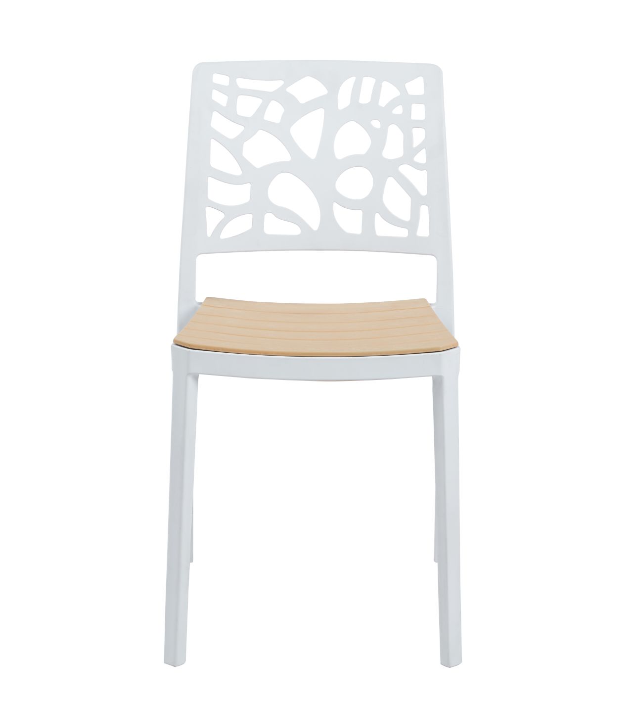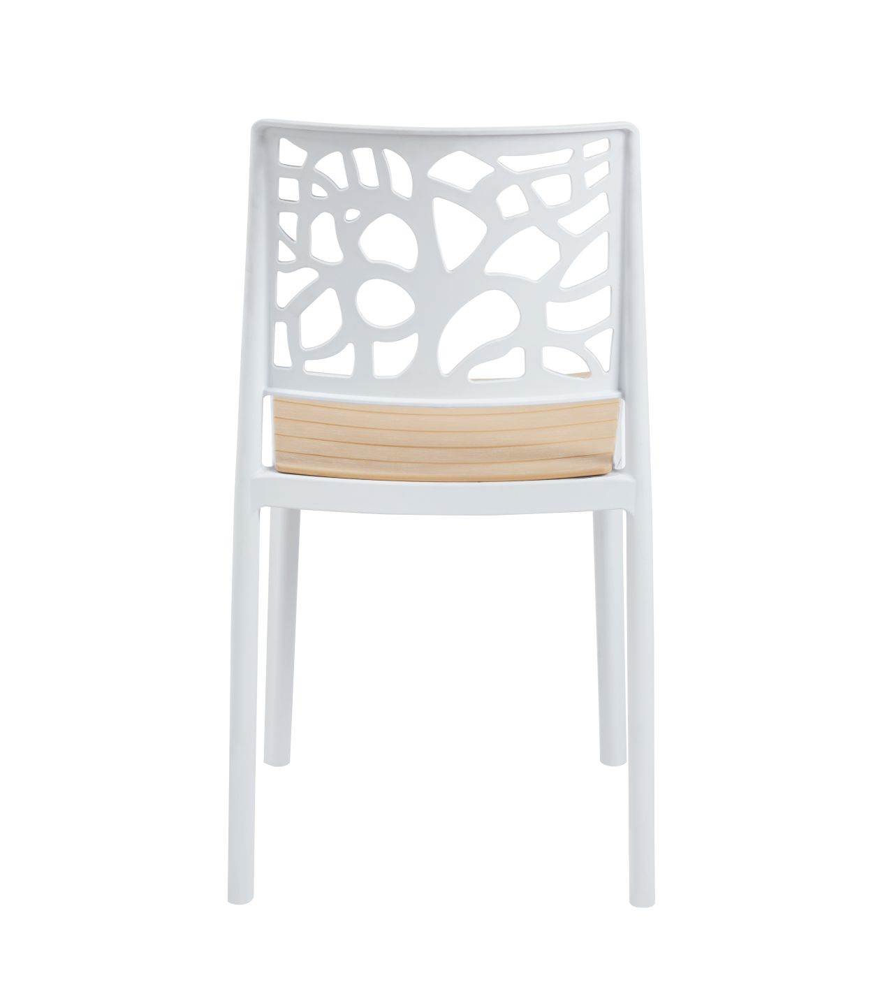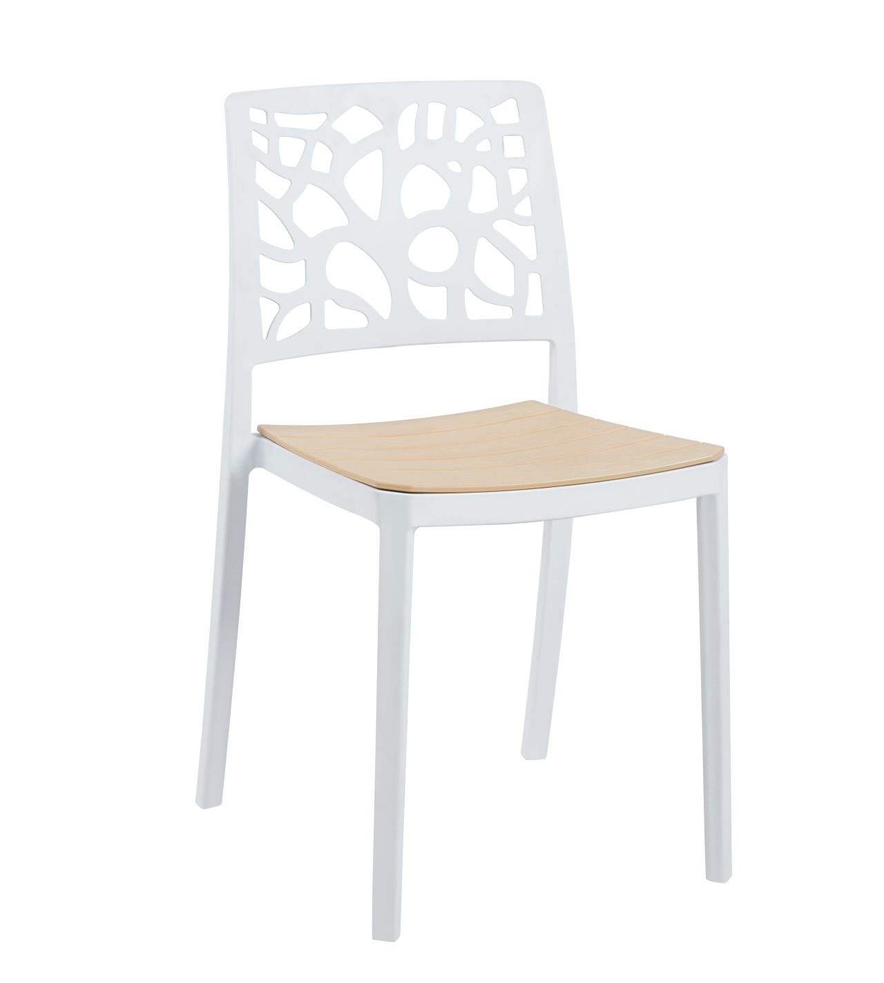 Stuhl mit leichter Konstruktion und dekorativer durchbrochener Rückenlehne und Sitzfläche in Naturfarbe. Schlichtes, modernes Design - leicht und praktisch für Restaurants, Cafés und Geschäftsräume.