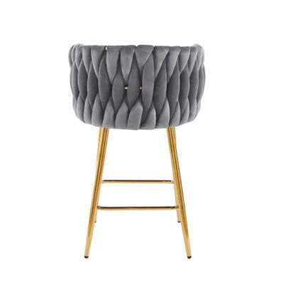 Krzesło barowe w stylu glamour z eleganckim, pikowanym oparciem i miękką, welurową tapicerką w odcieniu szarości. Złota, metalowa podstawa nadaje mu luksusowego charakteru i stabilności. Idealne do nowoczesnych restauracji i stylowych wnętrz.