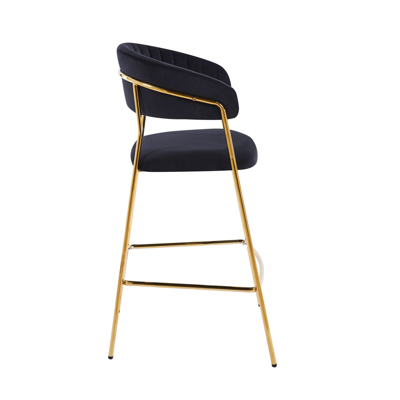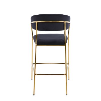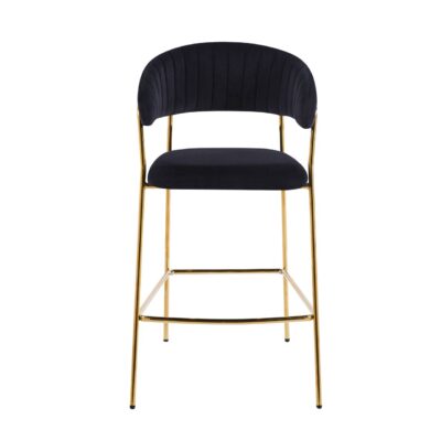 Stylowe krzesło barowe o zaokrąglonym oparciu z pionowymi przeszyciami, które nadają mu elegancki charakter. Miękkie siedzisko i podłokietniki zapewniają wysoki komfort użytkowania. Stabilna metalowa podstawa podkreśla nowoczesną formę i sprawdzi się w przestrzeniach gastronomicznych.