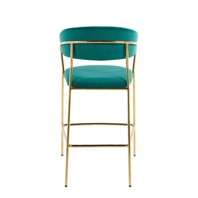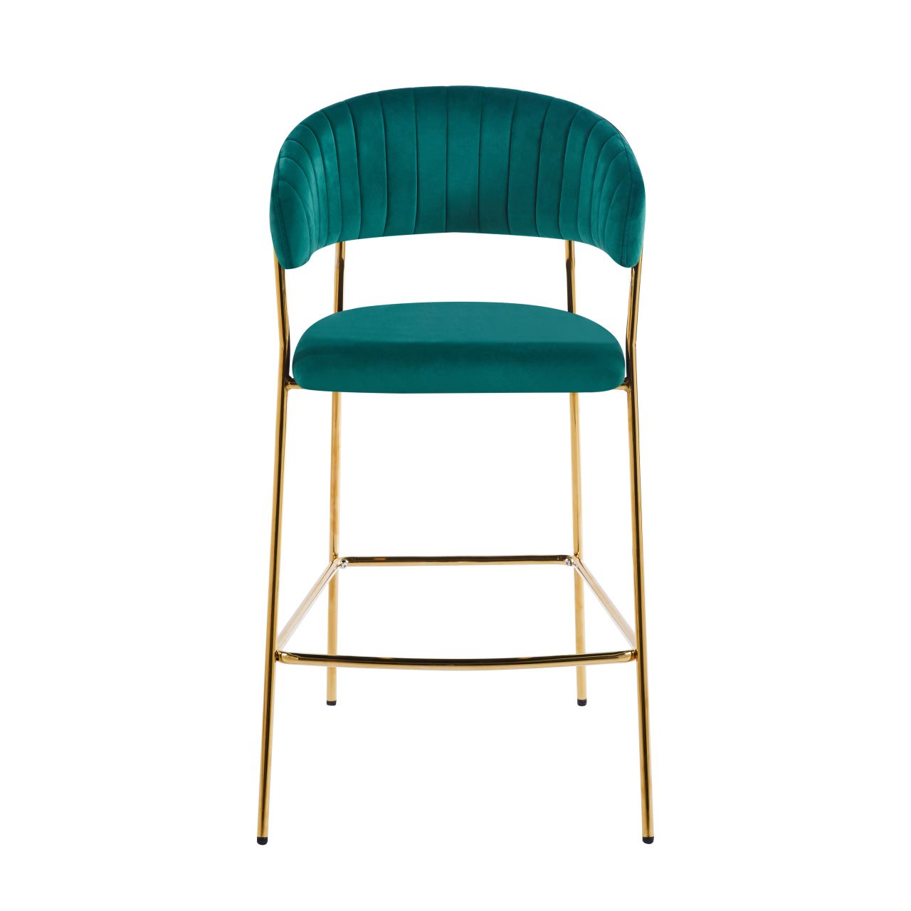 Stylowe krzesło barowe o zaokrąglonym oparciu z pionowymi przeszyciami, które nadają mu elegancki charakter. Miękkie siedzisko i podłokietniki zapewniają wysoki komfort użytkowania. Stabilna metalowa podstawa podkreśla nowoczesną formę i sprawdzi się w przestrzeniach gastronomicznych.