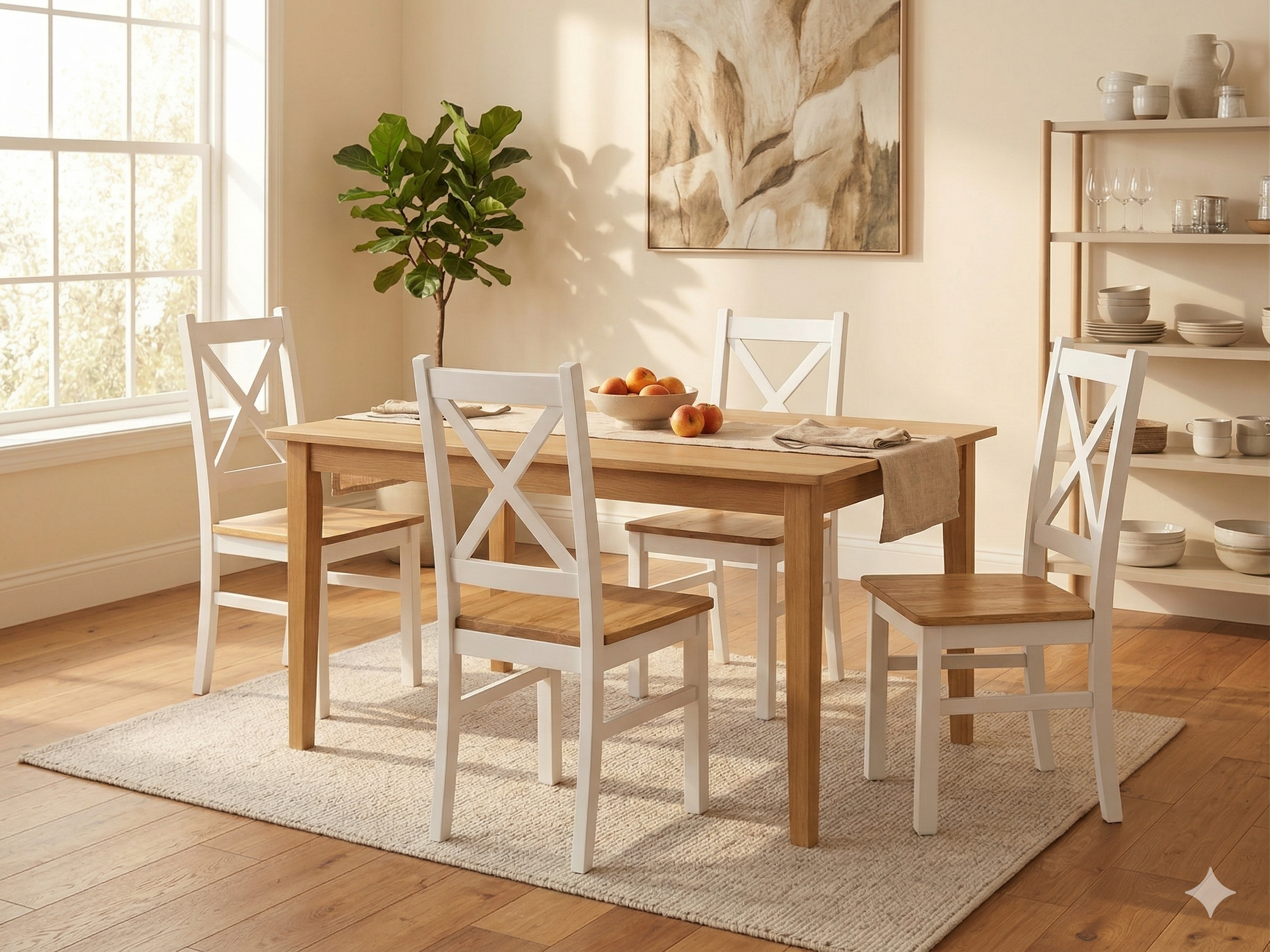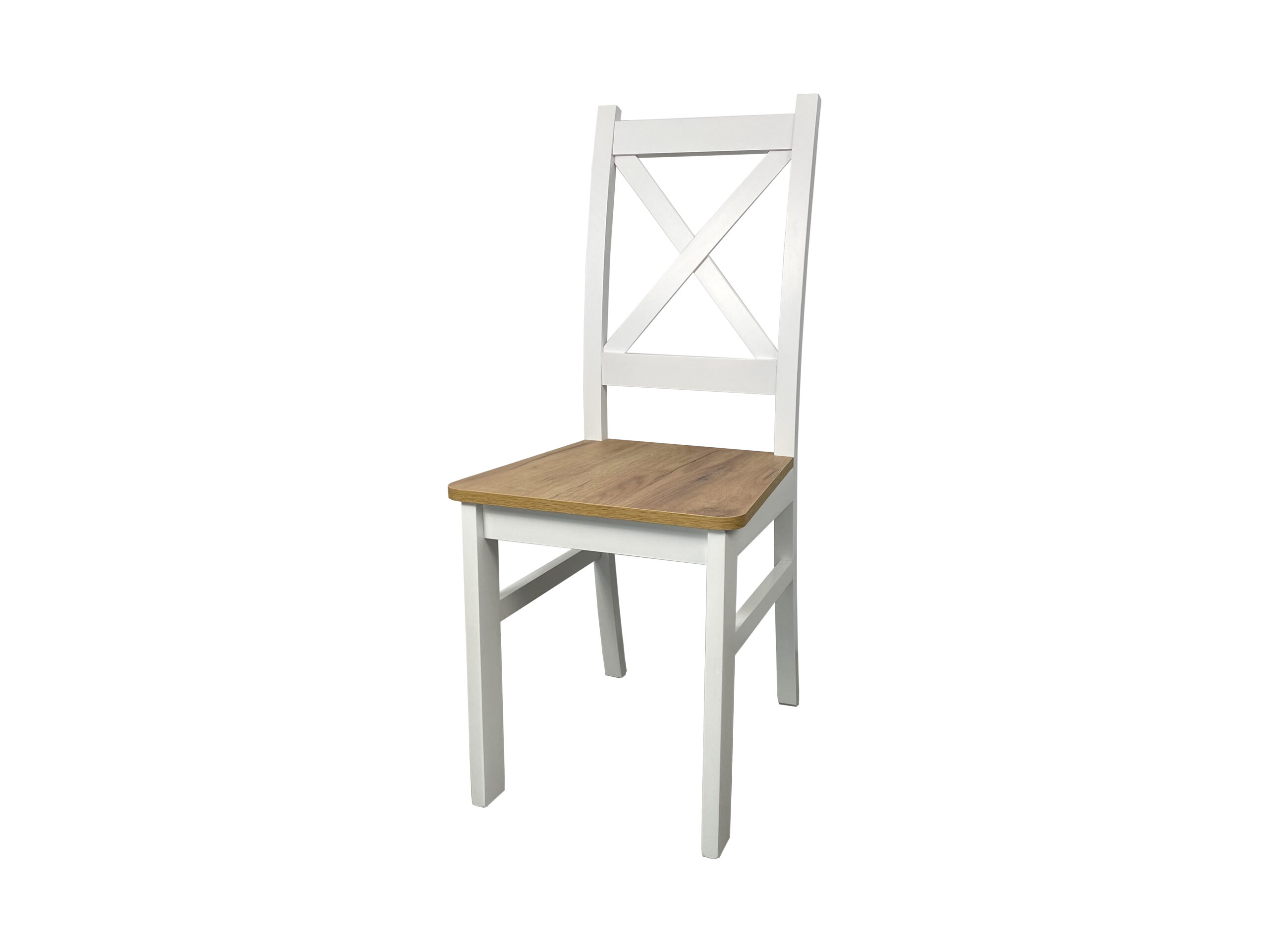 Krzesło KRZYŻAK – biały, drewniany stelaż z charakterystycznym krzyżem w oparciu i siedziskiem w dekorze drewna.