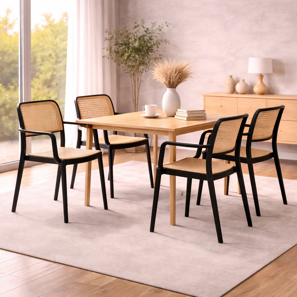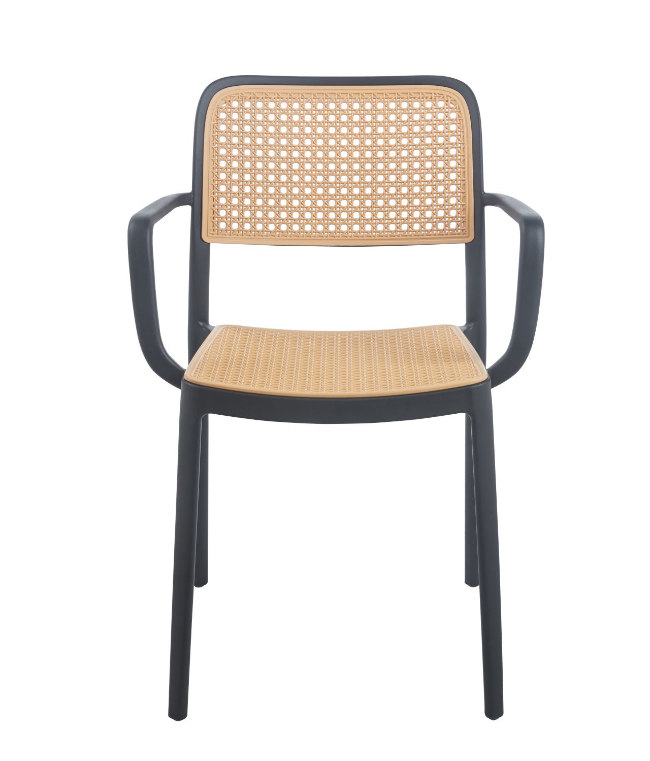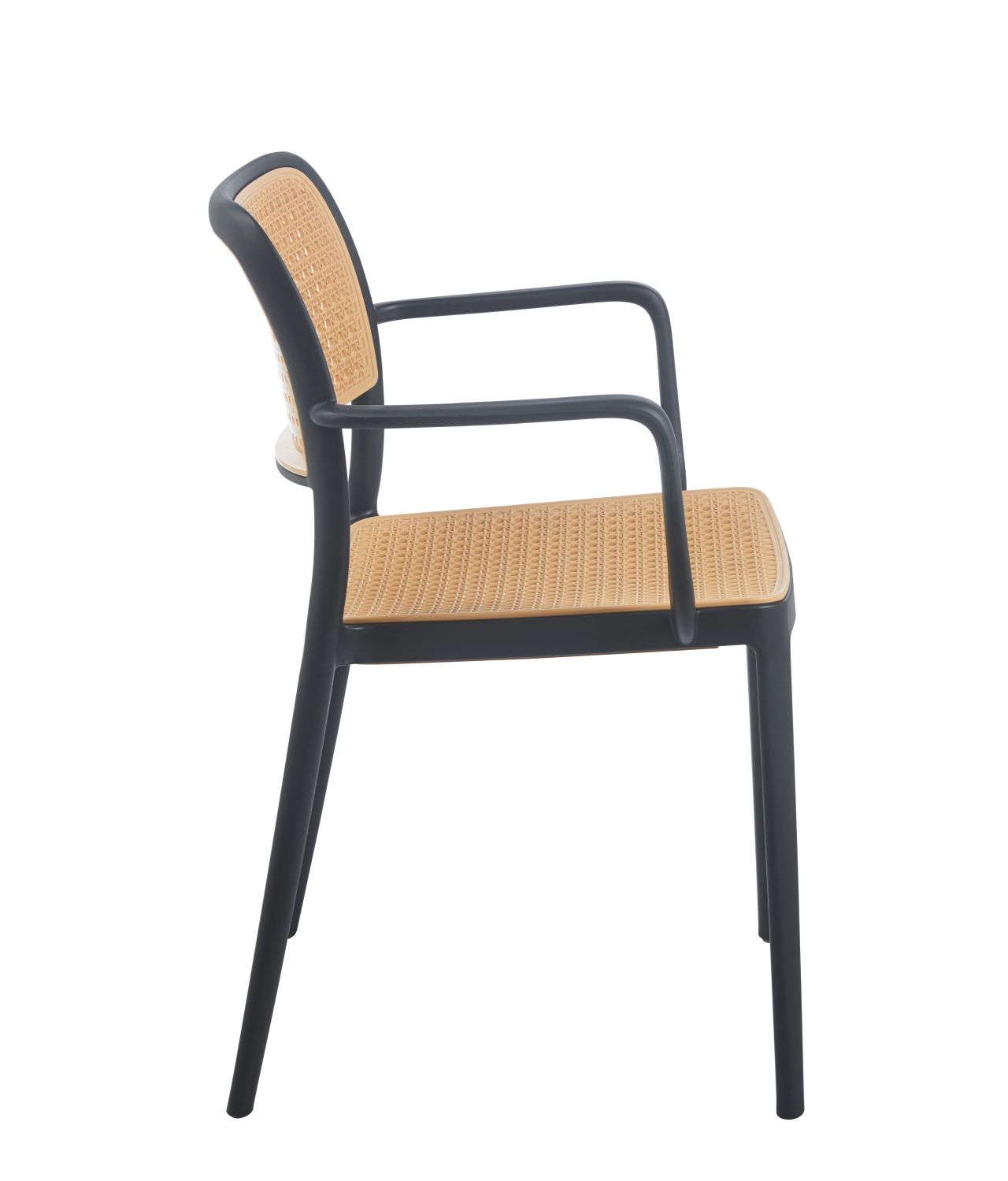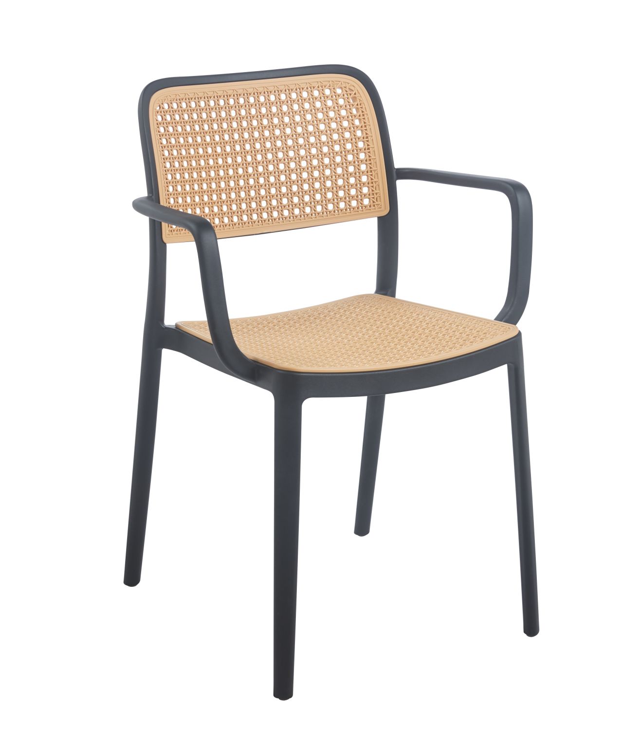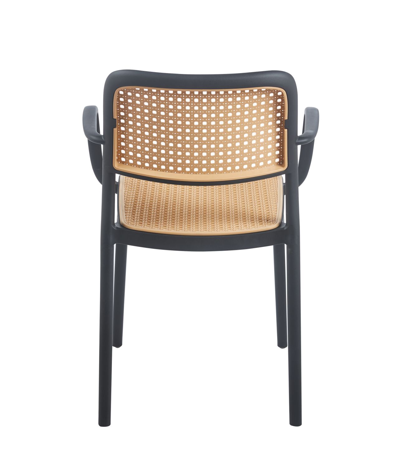 Krzesło z podłokietnikami, czarną konstrukcją oraz siedziskiem i oparciem z plecionki. Prosty, nowoczesny design inspirowany stylem bistro. Wygodne i funkcjonalne – idealne do restauracji, kawiarni i hoteli.