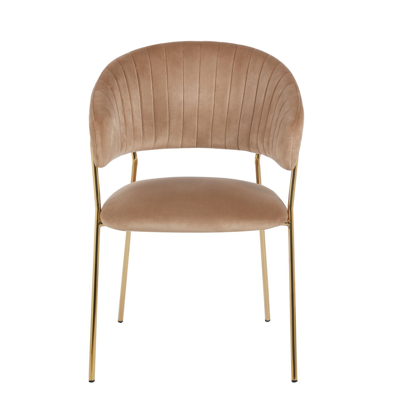Eleganckie krzesło tapicerowane z półokrągłym oparciem i dekoracyjnymi pionowymi przeszyciami. Stabilna konstrukcja oparta na metalowych nogach w kolorze złotym nadaje mu lekki, luksusowy charakter. Idealne do restauracji, hoteli i stylowych wnętrz.